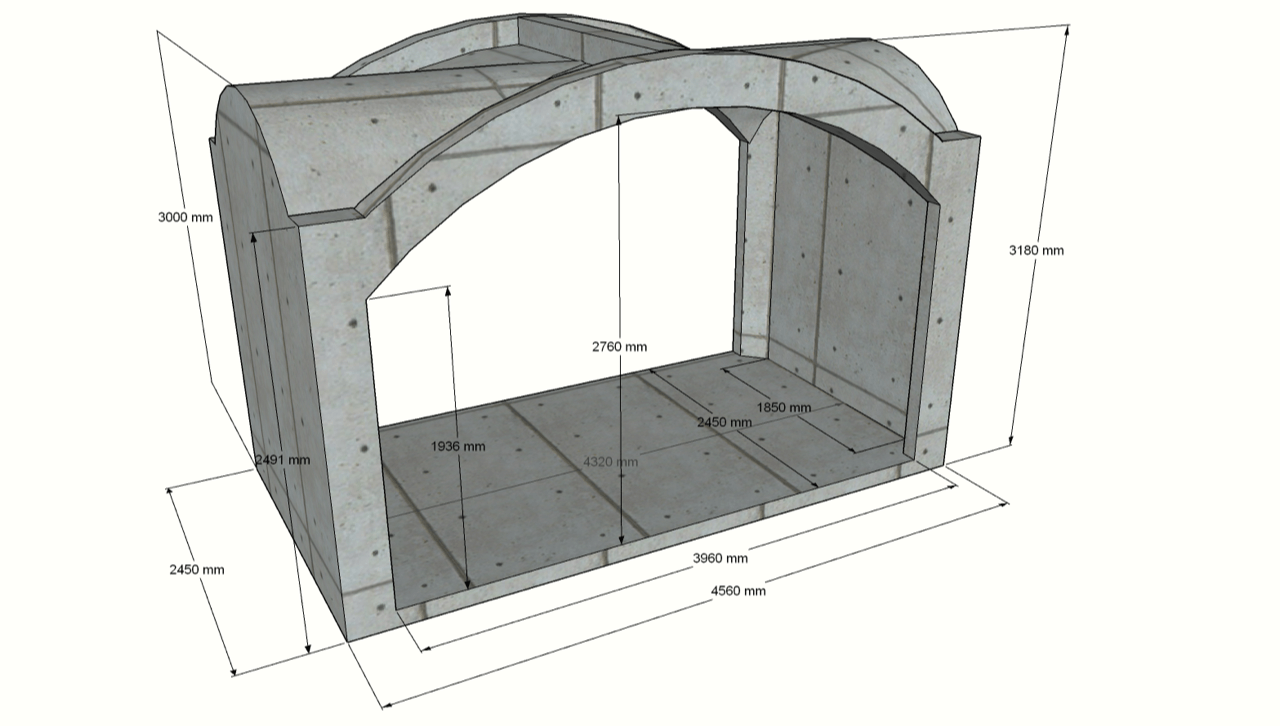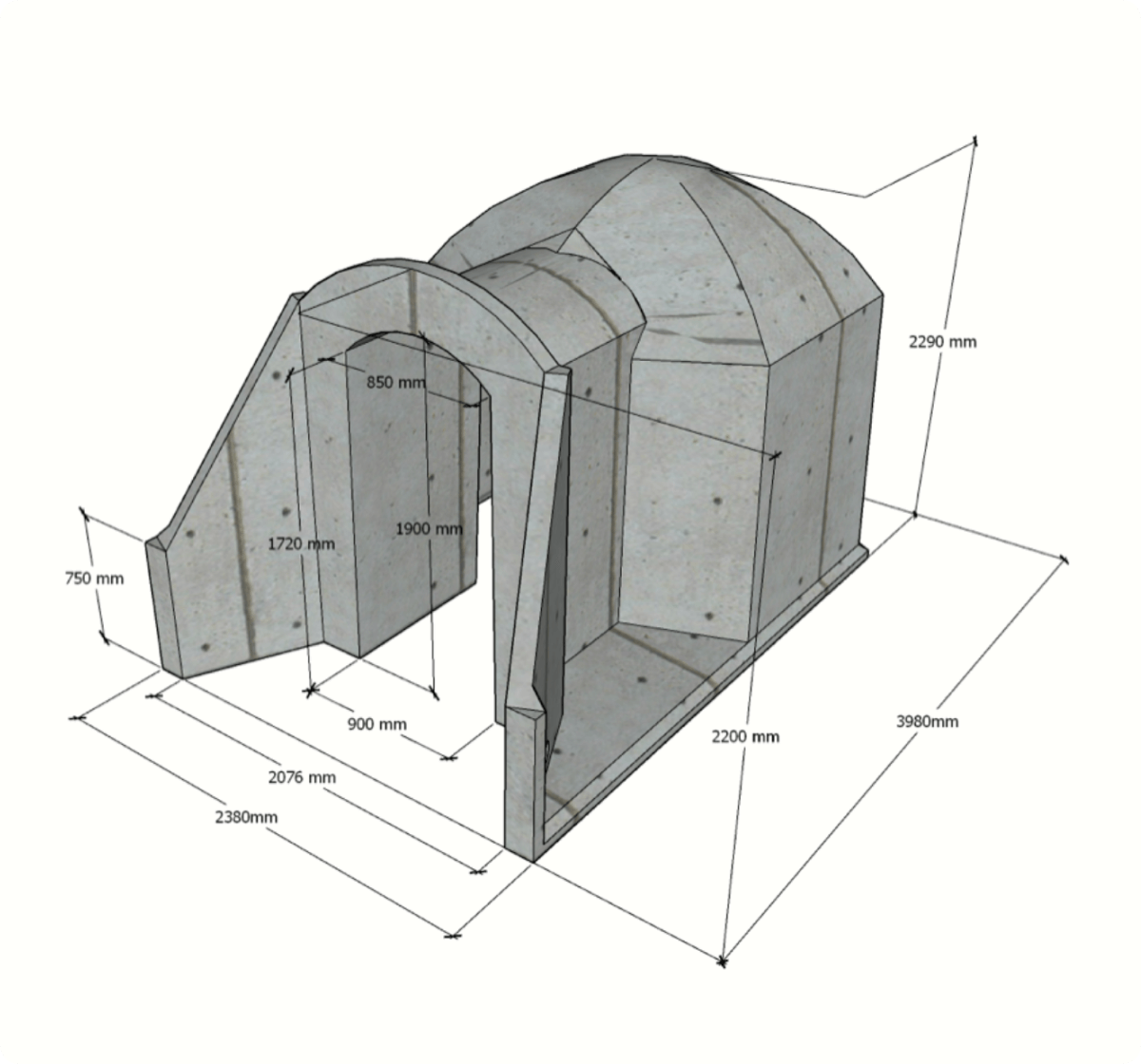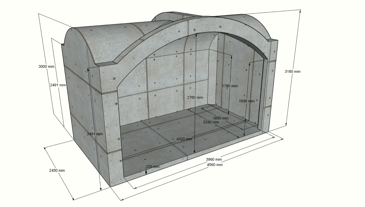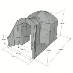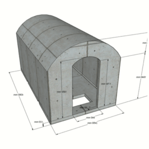 Onze booggewelf ruimtes zijn opgebouwd uit drie verschillende modules. De kleinste met een zeshoekig vloeroppervlak van 4,5 m2. Door de entree en de extra kamermodule met rechthoekig vloeroppervlak ontstaat een nog grotere ruimte van 11,7 m2. De plafondhoogte van de modules bedraagt 2,5 m.