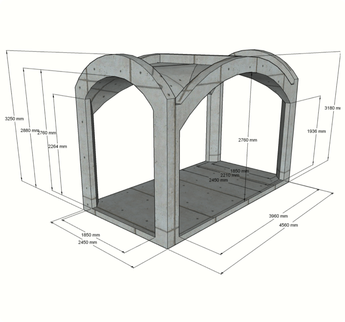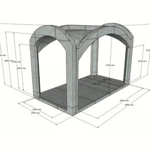 Onze kruisgewelf ruimtes zijn opgebouwd uit basismodules met een vloeroppervlak van 10,2 m2 en een plafondhoogte van 2,7 m2. Ze kunnen aan alle kanten worden gesloten of opengelaten om de modules aan elkaar te bevestigen, ramen en deuren in het gebouw te plaatsen of het gebouw helemaal open te laten. Het is mogelijk om booggewelfmodules en kruisgewelfmodules met elkaar te verbinden
